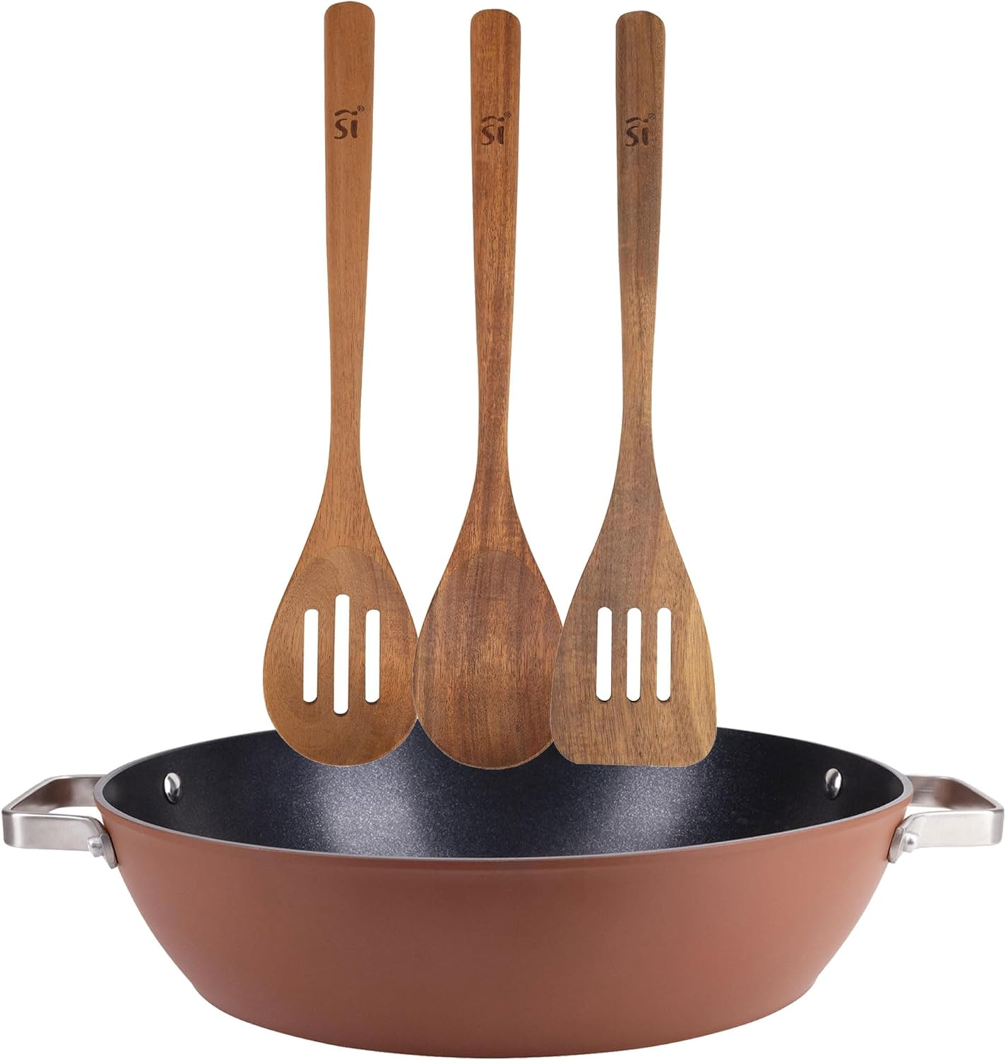 San Ignacio ▫️ Conjunto de tabuleiro em alumínio Ø32x8cm + 3 utensílios de cozinha em madeira