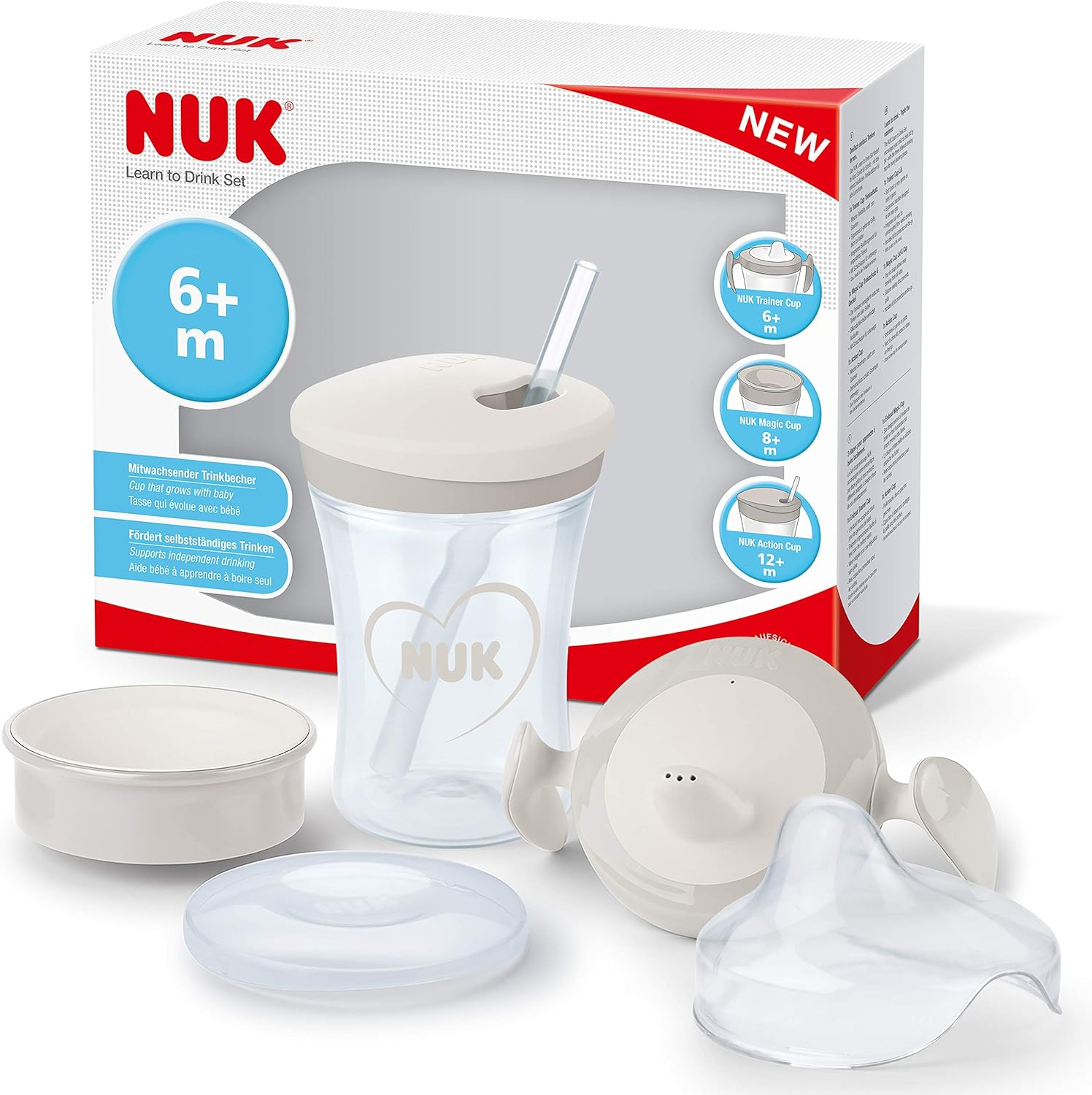 NUK ▫️ Conjunto "Learn to Drink" com biberão, 230 ml, sem BPA, cinzento e branco