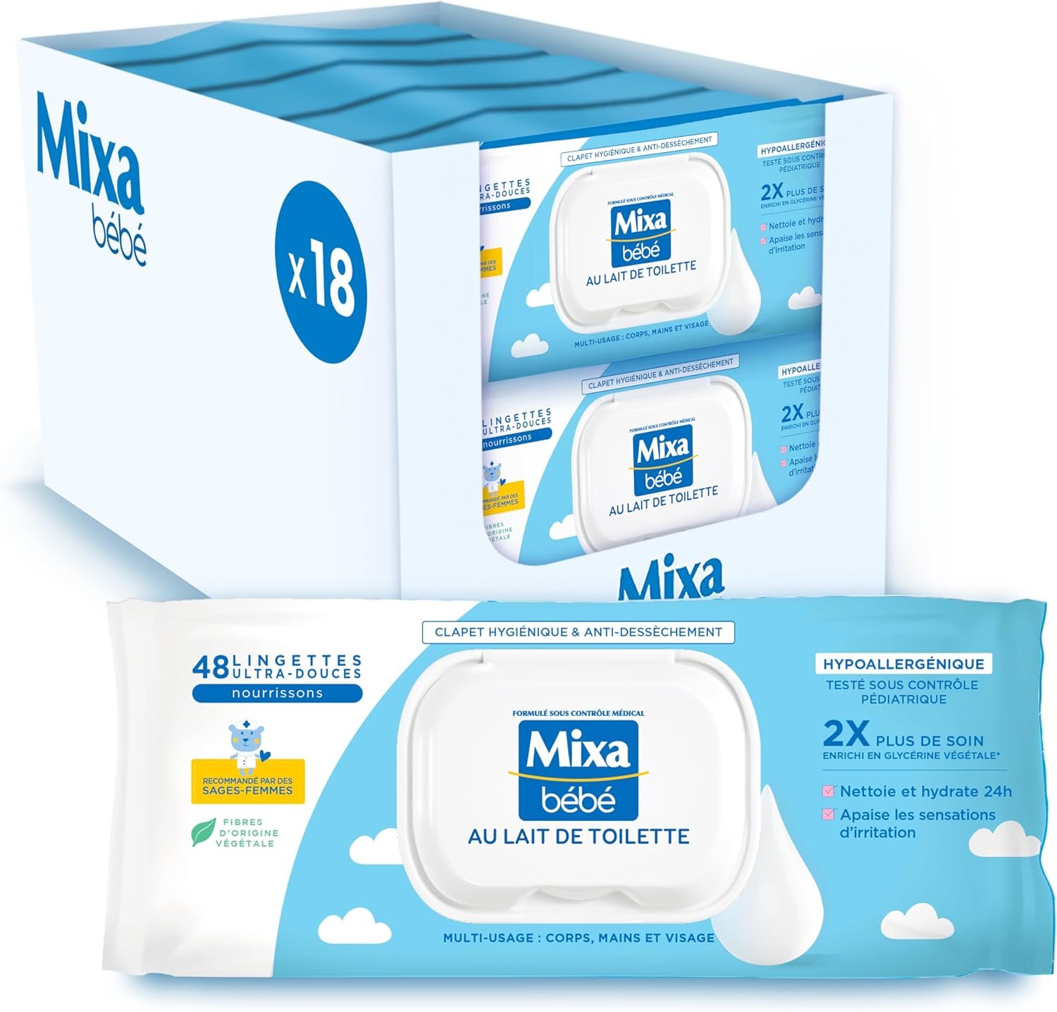 Mixa ▫️ Toalhetes para bebés com leite higiénico, 18 x 48
